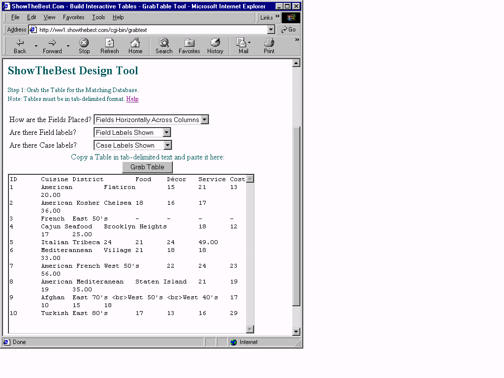 Click here to see the text of an example table -- in tab-delimited text. Click here to see the text of an example table -- in an Excel spreadsheet. Note that this second table includes HTML code.Note on Space Limitations This version of ShowTheBest limits the size of the table to 60 rows and 20 columns; each row-column cell in the table in limited to 150 characters, and the total size of the tab-delimited table is limited to 150K characters. (ShowTheBest.Com -- our file-based version of ShowTheBest which runs on your server -- does not have these limitations. ShowTheBest.Com also provides hooks to a server Database Management System (DBMS) or any other script that can retrieve the case database table.