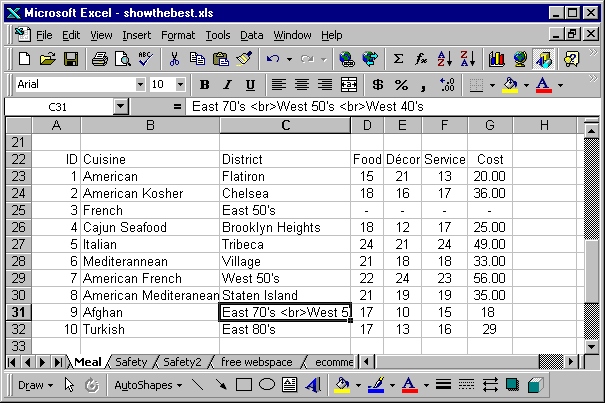 The picture below shows a table represented in Microsoft Excel. The field names (in the first row) are Cuisine, District, Food, Decor, Service, and Cost. The record names are 1, 2, 3, 4, 5, 6, 7, 8, 9, 10. As you can see the fields are horizontally across the columns, the case labels are shown, and the field labels are shown. The table can be any type of text: ShowTheBest will infer whether it needs to match on numbers or character strings. (The ShowTheBest Maps can be used to further specify the matching and scoring.) Note that we can even put in HTML code in the case labels and field labels. For example, if we want the label "Cuisine" to link to another page we can put (in cell B22)