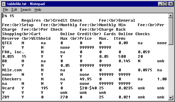 The first line of this file specifies the number of rows and columns in the table. Note that the record labels are provided in column A and the field labels are provided in row 2. The total number of rows in this table (including the record labels) is 24; the total number of columns (including the record labels) is 15.